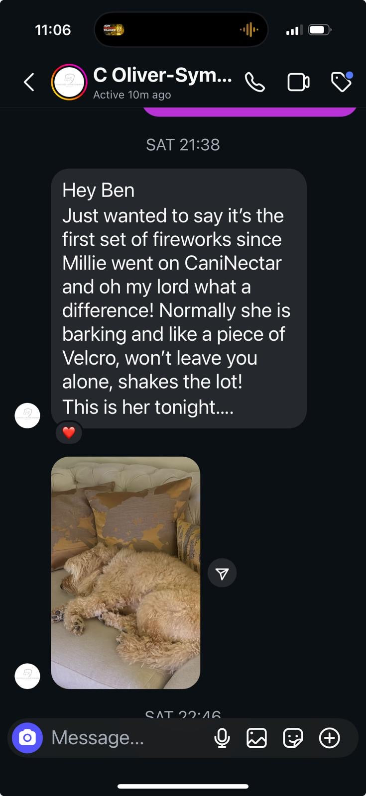 "Millie our dog seems to be having a noticeable difference since putting her on CaniNectar. She historically is a bit of a 'velcro' dog and wherever you go, she's attached to you which also extends to sitting by the front door with her face pressed against it when you leave until you get back! However, for the past week she has been so different! As I write this, she's lying in her bed in a different room and when I got back from the horses on all days this week she's not been face pressed against the glass which is so lovely to see!"